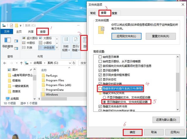 因为休眠文件隐藏的很深,我们需要点击查看-选项,取消选中“隐藏受保护的操作系统文件(推荐)”这一项;