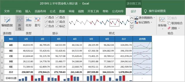 迷你图创建后,可以直观地反映数据对比或变化趋势。但是,如果目标数据不够突出或者图表不够完美,可以在迷你图表工具-设计选项卡中进行设计和美化。