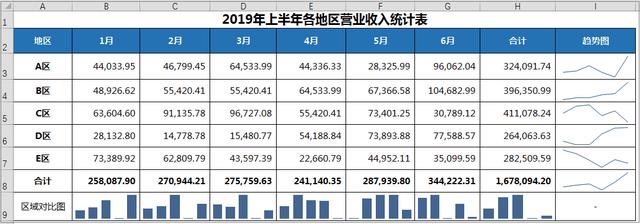 迷你图表的制作和设计极其简单。想学习制作Excel图表的,不妨先从迷你图表开始学起。下面以“2019年上半年营业收入统计表”为例介绍制造和设计方法。