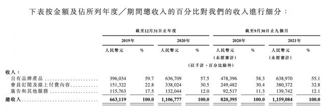 招股书显示,2019年、2020年和2021年前三季度,Keep总营收分别为6.6亿元、11.1亿元和11.6亿元。其收入主要由自有品牌产品、会员订阅和在线付费内容、广告和其他服务三部分组成,其中自有品牌产品是Keep目前最重要的收入来源,占总收入的50%以上。