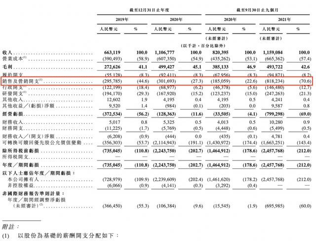 招股书显示,2019年、2020年和2021年前三季度,Keep的销售和营销费用分别高达2.96亿元、3.01亿元和8.18亿元,分别占总营收的44.6%、27.3%和70.6%。