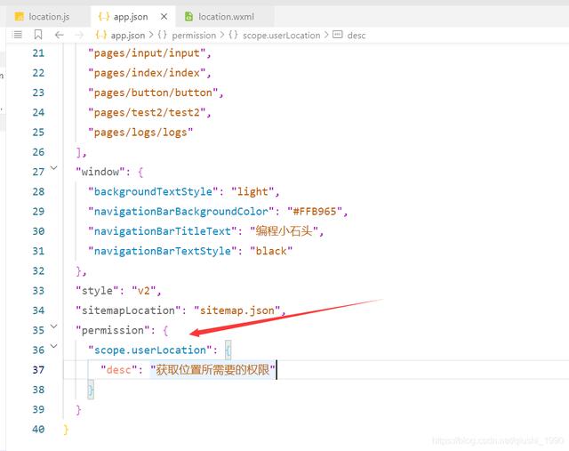 "permission": { "scope.userLocation": { "desc": "获取位置所需要的权限" } }
