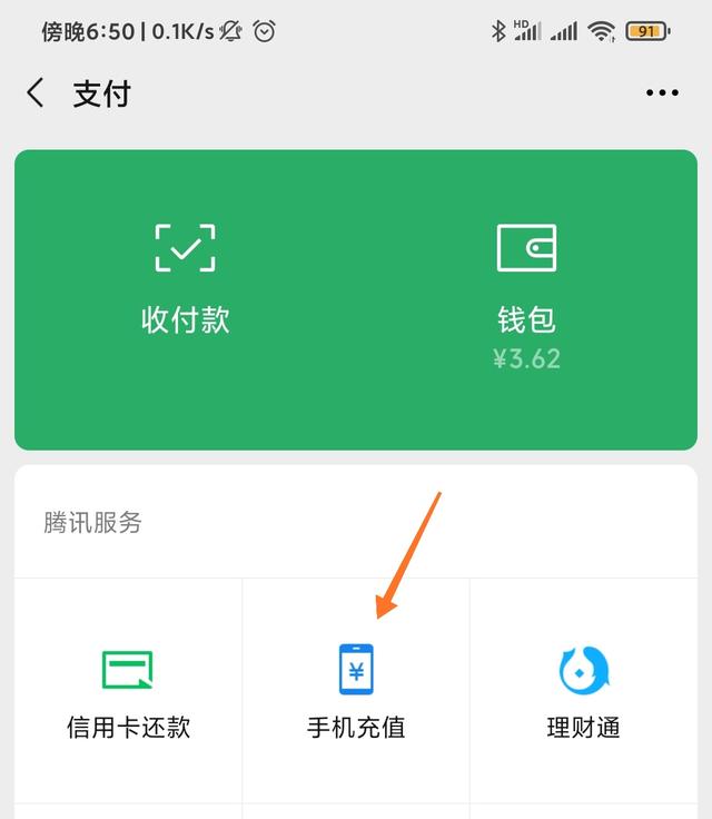 点击手机上的【支付】,此时会看到【手机充值】,点击即可。
