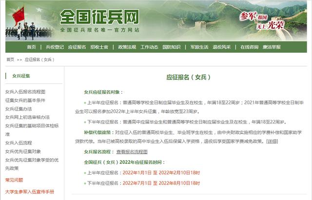 上半年申请对象:全日制应届毕业生和普通高等学校在校生,年龄18至22周岁;2021年普通高等学校全日制毕业生可报名参加2022年上半年女兵征集,年龄放宽至23周岁。