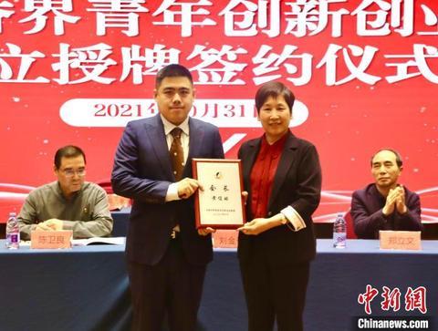 图为宁德市侨联主席陈伟良为宁德华侨青年创新创业联盟颁奖。吴·
