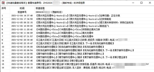 所有查询完成后,可以看到每个快递单号的物流状态。