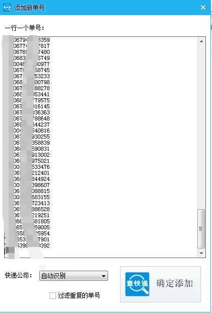 第四步:点击工具页面左上方的【添加单号】,将准备好的快递单号复制粘贴到新弹出的页面,不区分快递公司,然后点击【确定添加】。