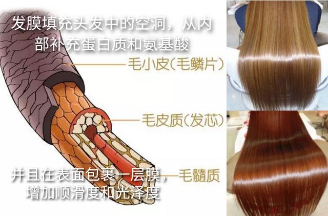 发膜早期的名字叫烘焙油,是通过加热将营养导入头发,滋润修复受损发质。这就是发膜的作用。发膜的分子结构很小,可以进入头发皮质,填充头发受损形成的空孔洞,将蛋白质和氨基酸带入头发,修复头发表面受损的毛鳞片。