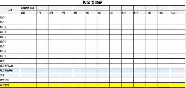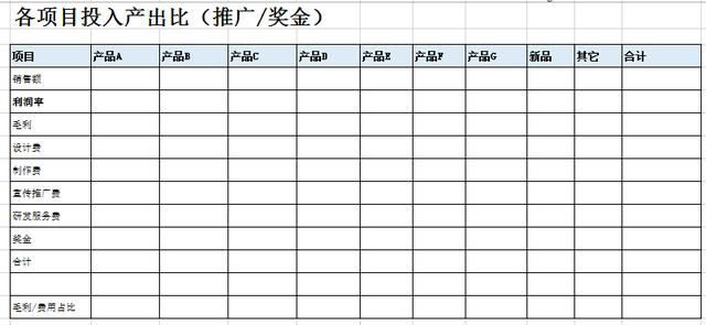| 表名 | 表格描述 | 首先我。商业目标 | 阐明公司的经营目标(销售目标,利润指标 | 第二,各模块的预算分配和预算比例 | 各模块成本比例(清楚看到预算模块比例) | 第三,公司毛利分析表 | 清楚了解公司的毛利构成,各产品的毛利贡献。 | 第四,各部门预算(工资) | 各部门的人员编制和工资预算。 | 五,奖金分配详情 | 奖金分配详情 | 六,各部门的详细预算汇总 | 按部门列出的项目成本预算汇总 | 七,费用比例排名表 | 清楚了解各项费用预算的比例排名。 | 八,推广费用明细表 | 推广费用分解到每个产品,每个项目。 | 九,固定成本和浮动预算明细 | 根据固定预算和浮动预算,清楚了解每月的固定支出。 | 十,各部门成本比率和月度成本比率 | 了解各部门的费用占比,每月费用占比。 | 十一,各部门月度预算表 | 公司每月支出汇总 | 各部门每月费用明细 | 22018年各部门月度计划表 | 人力资源部月度计划表 | 每种产品的投入产出分析 | 每种产品的投入产出分析 | 十三,资本流动表 | 每月现金需求表 |