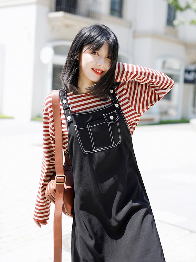 一条嫩嫩的背带裙,不注意的话很容易让人觉得幼稚,所以在选择的时候尽量简化裙子本身的设计元素。可以选择更稳重简约的黑色款,里面穿上衬衫,就算通勤也没问题。