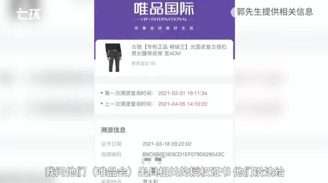 根据报纸的报道,消费者郭先生于3月8日在唯品会购买了一条古驰皮带,价格为2549元。3月20日收货后,他发现尺寸不符,于是发给收购App鉴定,以便日后转卖。8天后,被收购的App给出了鉴定证书,称古驰腰带是假的。