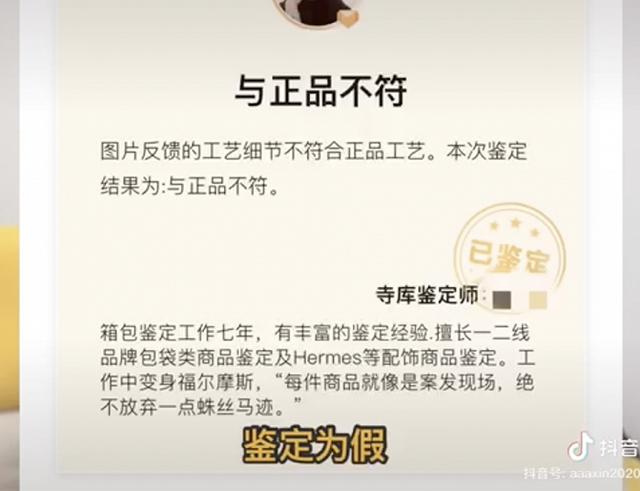 2020年7月,“阿江星”在个人Tik Tok账号中称,同年6月从寺库购买了一个博柏利博柏利挎包,但收货后发现包装简陋,做工粗糙,于是将商品详情上传至寺库平台,供寺库鉴定师查看。鉴定结果是假的。