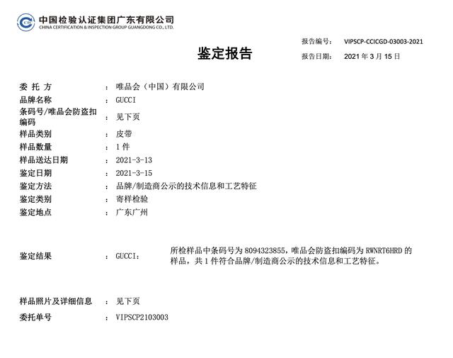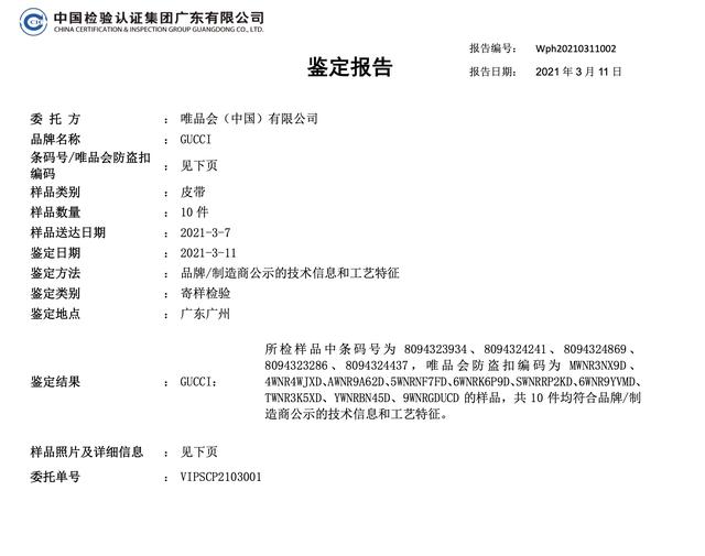 “我们经过核实,这批古驰腰带将由唯品会直接在海外进行代购,代购环节清晰可靠、合法合规,确保正品。这批货物也由中国检验认证集团抽样并通过鉴定。另外,每条古驰腰带都配有唯品会正品防伪扣,可以规避其他不可控风险。”