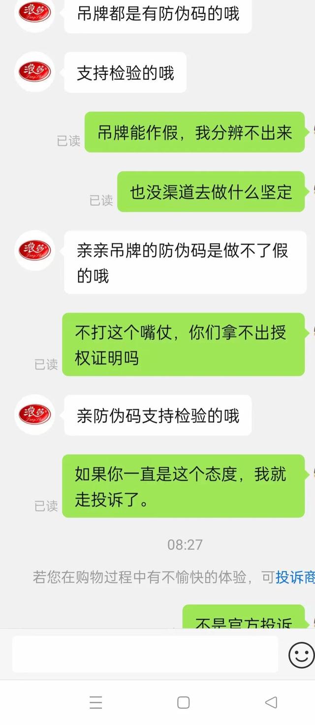 我让她证明她卖的是正品浪莎裤。并出示授权证书。她不可能一直拿出来,她应该已经判断出我已经把标签丢弃了。重复标签可以辨别真伪。这个时候我已经放弃要求客服正视我的问题了。相反,我告诉了她我的下一步计划。