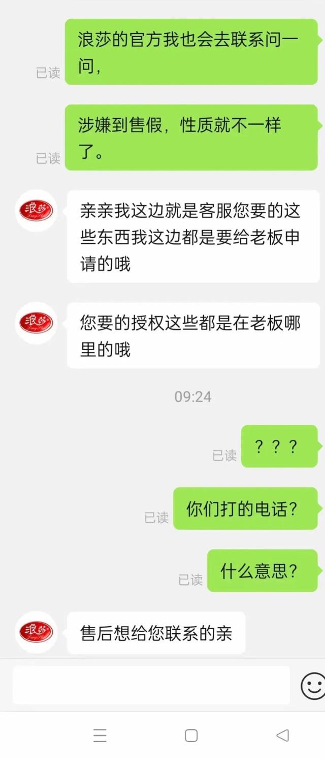 她没给我看授权证书后,我提醒她制假售假和质量差的性质是不一样的。此时,我已经放下手机,忙碌的孩子们也不再关注。期待回应。我错过了他们的两个电话,因为手机在后面静音了。回到在线交流。