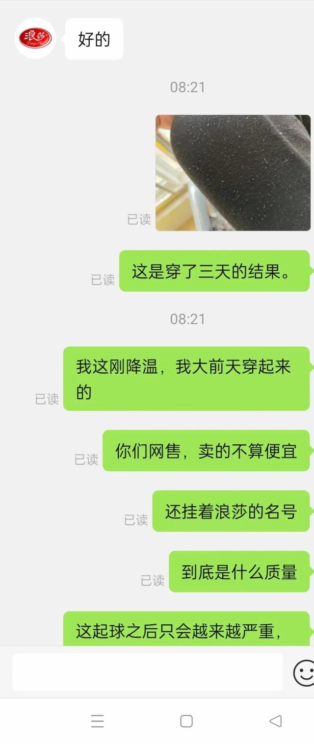 东西很快就收到了。收到后,因为那几天孩子咳嗽得厉害,我没有仔细检查吊牌,更不要说人工仔细检查质量了。我把洗衣机放在水里。这是我的减法运算,反面教材。月初气温升高,这裤子穿不下了,就收起来了。直到14号,天冷了,我才想起这条裤子。15号穿的时候居然发现大腿内侧起球了!因为白天忙着照顾刚咳嗽退下来的孩子。售后一直没找客服。晚上孩子睡着了,我去找店家客服交涉。客服让我拍照证明,因为晚上光线不好,我决定第二天白天给她拍。
