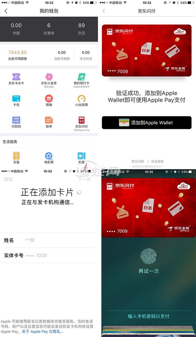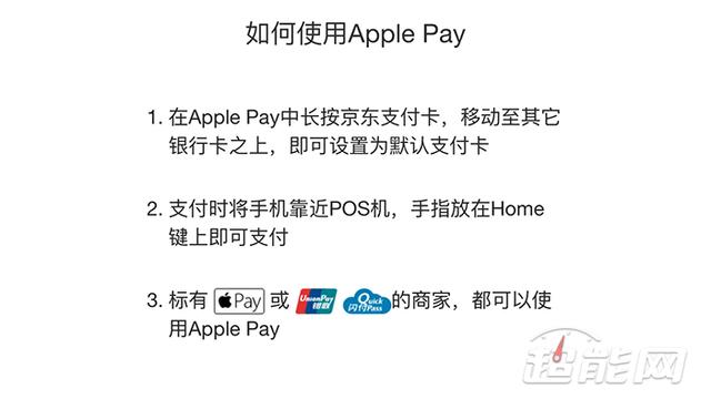 安卓系统的JD.COM闪付在JD.COM上线53天后,京东金融借助苹果对Apple Pay的推广,正式推出面向苹果iPhone的京东支付。本质上就是Apple Pay,也是基于银联中国银联快速通行系统的产品。只有iPhone 6之后诞生的带有NFC模块的iPhone才能支持该功能。启动“JD。COM闪付嘉年华”与Apple Pay同步,覆盖线上线下店铺。