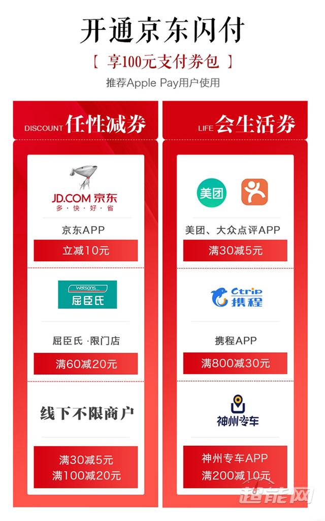 不过,京东金融也为JD.COM闪付准备了一系列活动。首次完成JD.COM闪付服务开通,自动获得100元JD Pay优惠券包,有效期30天。同时,只要在8:00-24:00使用Apple Pay,每天立减7.18元,15万优惠名额。