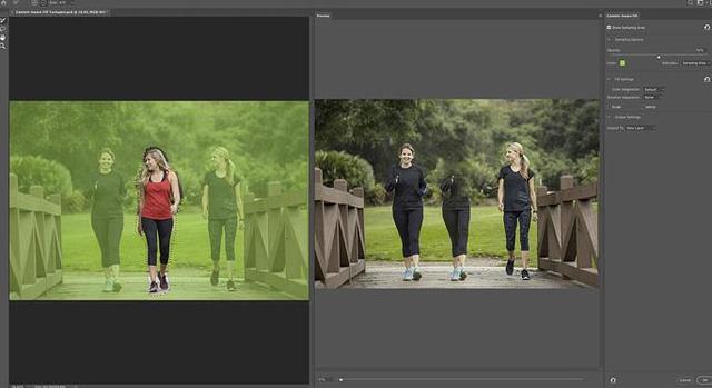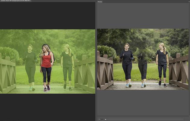 如果我们看一下预览面板,就会发现内容感知填充最初的效果并不是很好。Photoshop正在使用左边女人的像素来填充我在中间选择的区域: