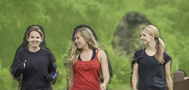 然后,在要删除的区域上画就行了。我将在左边的女人身上画画,并将她从覆盖图中移除:
