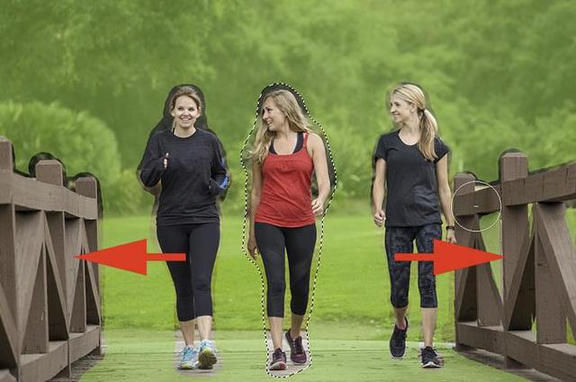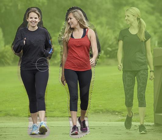 在这张图片中,我想删除中心的女人(穿红衣服的女人)。