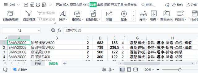 如下图所示:在B列的单元格中输入一个图号,右边的名称、材料厚度、材料长度、材料宽度、表耗、材料、工艺等参数和信息会自动生成(生成的数据来自后面的数据表)。