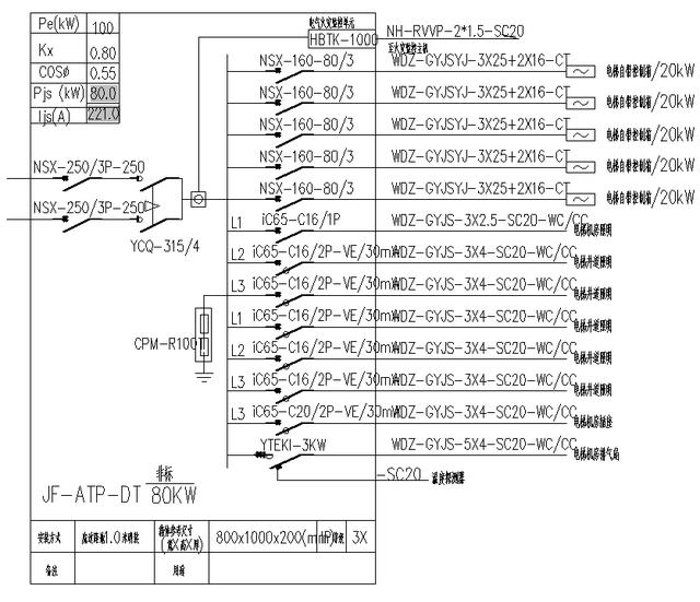 配电箱系统图的认识图中双电源上端的两个NSX-250/3P-250A是两个塑壳断路器。配电箱为双电源进线,一条线为市电,一条线为发电机。YCQ-315/4是双电源的型号,4极315 a;;双电源用于实现市电和发电机电源之间的转换,两种电源互为备用;CPM-R100是一个电涌保护器,或电涌保护器;其作用是将雷电浪涌电流快速泄入地下,从而保护电气设备免受雷击。它能有效吸收突发的巨大能量,保护连接设备不受损坏。NSX-160-80/3是出线处的塑壳断路器,IC65是出线处的小型断路器,也叫微型断路器;WDZ-GYJSYJ-3x 25+2x 16-CTWDZ-GYJS(F)为低烟无卤交联聚烯烃绝缘线,3×25为三根25mm线ABC三相火线,2× 16为两根16mm线,一根N线,一根PE线;CT-沿电缆槽敷设;WDZ-GYJS-3 x4-SC20-WC/CC3×4是三根4mm线,L火线,N零线,PE地线;CC-表示埋在屋顶或屋顶