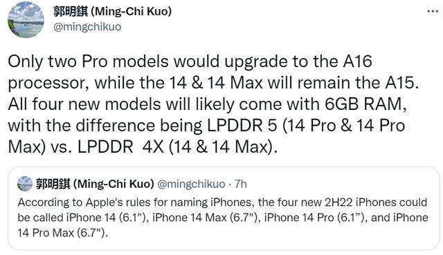 天风国际分析师季表示,将于9月发布的iPhone 14系列将有两大变化。