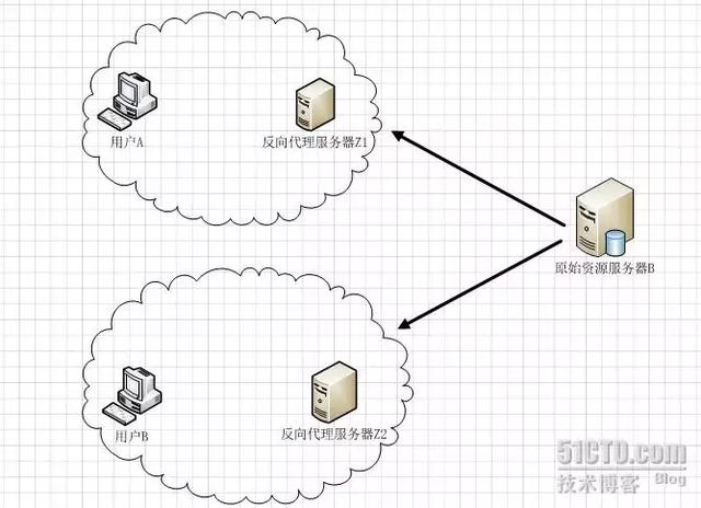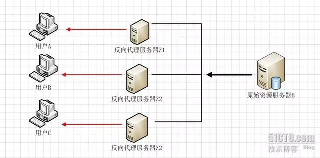 用户A一直认为自己访问的是原服务器B而不是代理服务器Z,但实际上反向代理服务器接受用户A的响应,从原资源服务器B获取用户A所需的资源,然后发送给用户A,由于防火墙的原因,只允许代理服务器Z访问原资源服务器B,虽然在这个虚拟环境中,防火墙和反向代理共同保护原资源服务器B,但用户A并不知情。