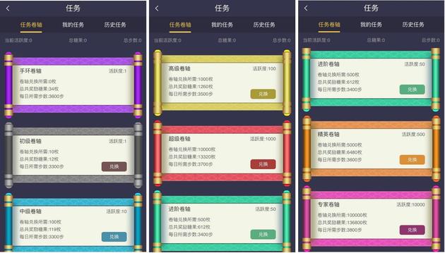 此外,记者从趣步APP可以了解到,每当有新用户在趣步APP注册,趣步平台都会先送出一个免费的任务卷轴,奖励34个趣步糖果。之后,开启一个新的初级卷轴,用户需要花费10颗糖果,任务完成后,用户将获得12颗糖果奖励和1次活动。此外,《中级卷轴》、《高级卷轴》等启动任务需要不同数量的糖果,任务完成后可以获得相应的糖果数量和活动积累。
