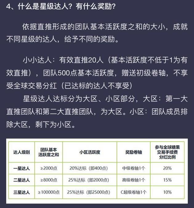 “小天赋(团队级别)每天分红40-50,一星天赋每天分红45-500,二星天赋每天分红1000以上。”在小蓝给出的分红图中,记者看到一星人才分红比例为20%,二星人才分红比例为15%,三星级人才分红比例为10%。