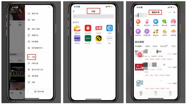 不太受欢迎的是,在美团小程序在Aauto Quicker平台上线之前,美团外卖服务已经可以在Tik Tok使用,入口隐藏在“功能”页面。