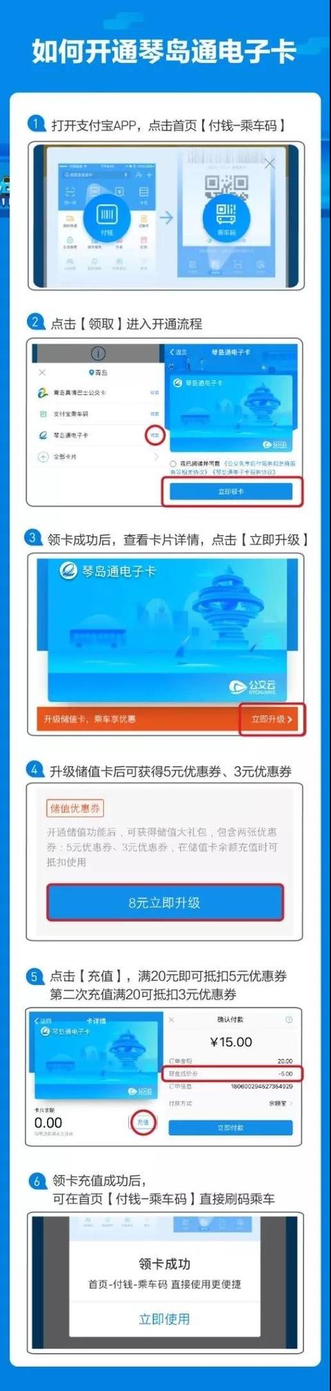 打开“琴道通电子卡”,在支付宝APP首页点击“支付”,然后点击页面下方的“乘车码”,即可领取“琴道通电子卡”,升级充值后即可使用。