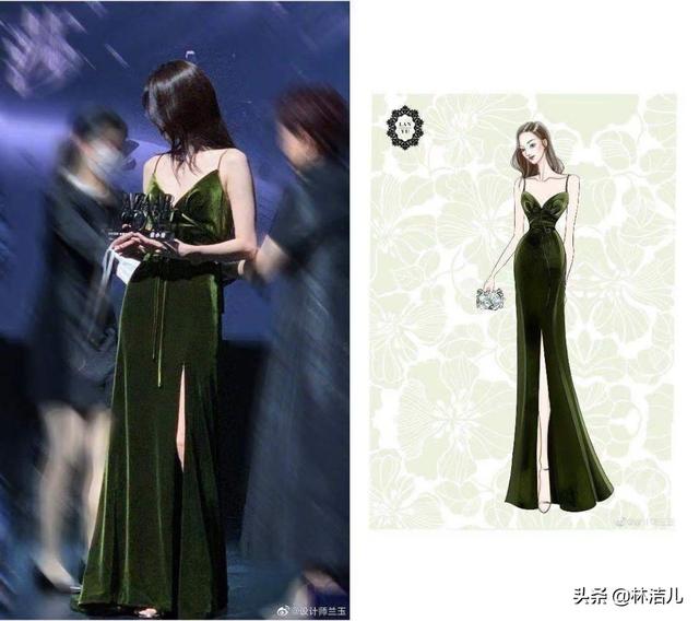 不得不说,张这次的礼服选择真的非常合适,天鹅绒的质感展现出高级感。相比那些薄纱和雪纺材质的连衣裙,这种略显成熟的丝绒裙更符合她自身的气质。蓝宇还根据张的造型图重绘了一份手稿,可见她对自己的演绎非常满意。