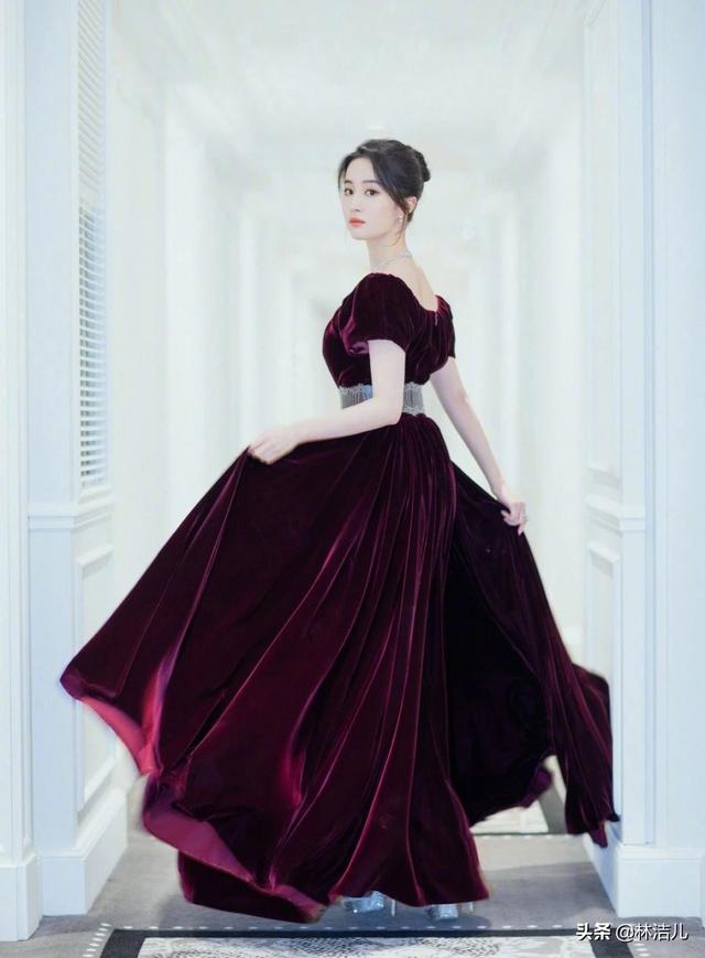 “神仙姐姐”刘亦菲完美hold住了酒红色丝绒裙,泡泡袖+蓬松裙,以及高丸子头发型,展现出强大的气场。她是迪斯尼的逃跑公主。