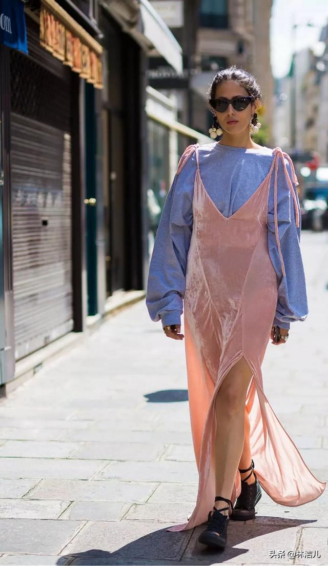 如果想减少老气的感觉,也可以用丝绒裙来叠穿。比如下面的粉色丝绒裙,叠搭蓝色长袖上衣,既有减龄的效果,又增添了一丝风情。