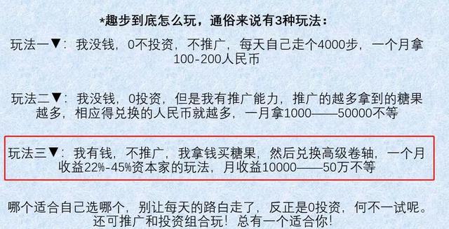 该软件声称拥有3000万用户。用户只需安装趣步App,记录每天的步数,即可获得“趣步糖果”。广告上说,只要每天用手机和软件走上4000步,一个月的保障就能赚200元,一个月甚至能赚到2万元。