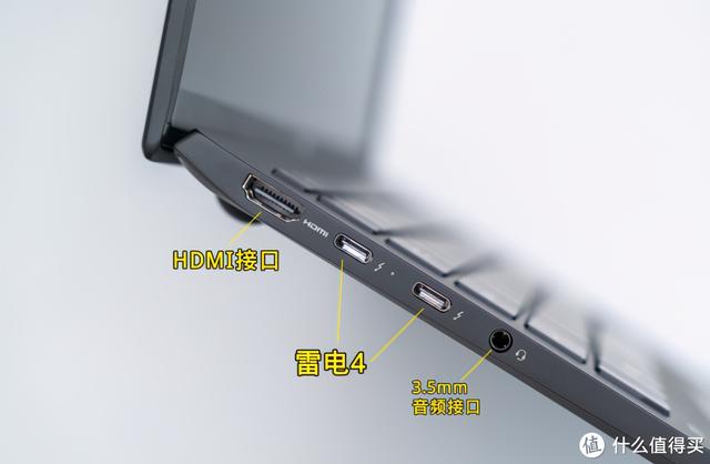 14.接口方面,键盘左侧有一个HDMI接口,两个thunderbolts 4和一个3.5mm音频接口。