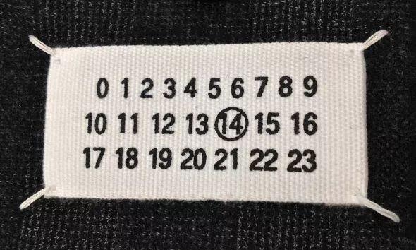 缝在衣服上的马丁·马吉拉品牌衣服的LOGO,只用白布块或用数字0~23中的一个圈起来的布块,来表示衣服所属的设计系列。比如0号系列表示手工系列,女装基本服装配饰用6号表示,10号是男装系列的代号,鞋子是22号,印花和配饰是13号;随着系列的更新,会出现更多不同的数字。