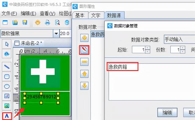 点击软件左侧的“实体A”按钮,在画布上绘制普通文本,双击普通文本,点击图形属性-数据源中的“修改”按钮删除默认数据,在下面的状态框中输入需要手动添加的信息,点击编辑。