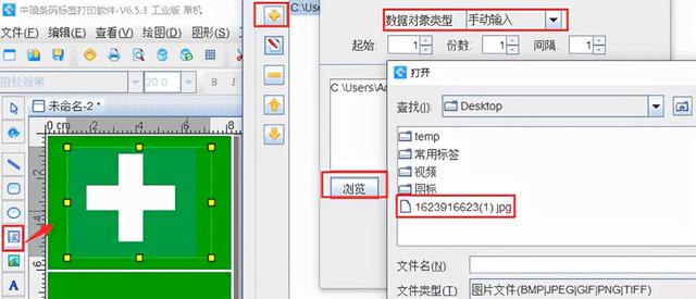 点击软件左侧的“插入位图图片”按钮,在画布上绘制一个位图对象,双击位图,在图形属性-数据源中点击“+”按钮,选择数据对象类型为“手动输入”,点击左下角的“浏览”,选择要插入的图片-打开-添加-确定。