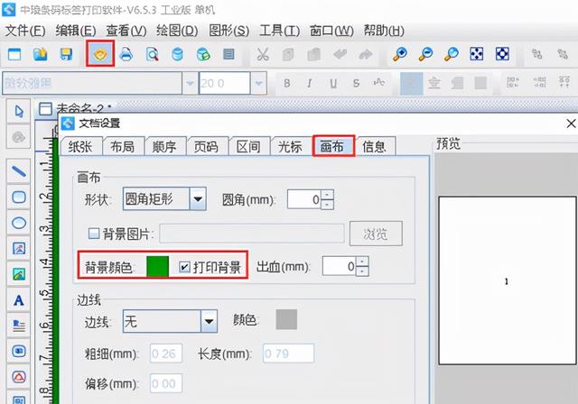 在标签制作软件中创建新标签后,单击软件上方工具栏中的“文档设置”按钮。在文档设置-画布中,根据自己的需要自定义画布的背景颜色,勾选打印背景,点击确定。