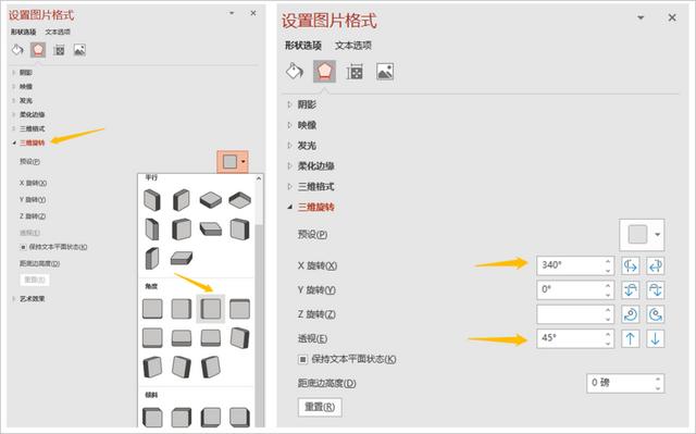 3.然后设置右边图标的三维旋转,选择 perspective-left。操作是一样的。