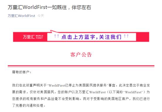Hugo.com获悉,2月1日,万里汇WorldFirst官微发布声明称,停止向美国居民提供服务是出于业务发展的需要,且仅针对美国居民。卖家的账户以及万里汇WorldFirst(以下简称“WorldFirst”)提供的现有服务和产品将不受任何影响。对于美国受影响的客户,WorldFirst做了完善的沟通和处理。