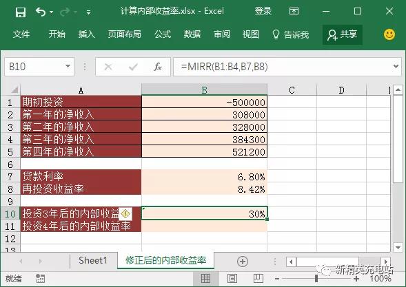 步骤01输入计算公式。复制[Sheet1]工作表,并将其重命名为“修订的内部收益率”。中间插入几行单元格,输入贷款利率和数据。在B10单元格中输入公式“=MIRR(B1:B4,B7,B8)”,得到该项目的投资3年后的内部收益率[30%],如图所示。