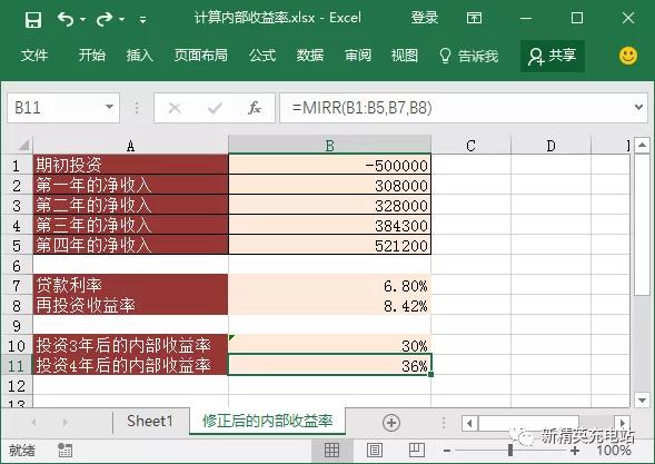 比如分析上一个案例的投资项目,如果贷款利率为6.8%,再投资收益率为8.42%。此时可以用MIRR函数计算修正后的内部收益率,具体操作步骤如下。
