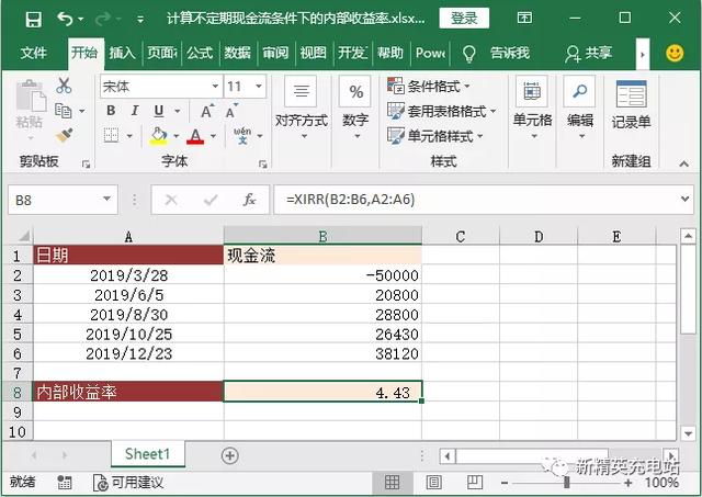 新建一个工作簿,输入如图内容,在B8单元格中输入公式“=XIRR(B2:B6,A2:A6)”,计算不规则现金流下的内部收益率为[4.43]。