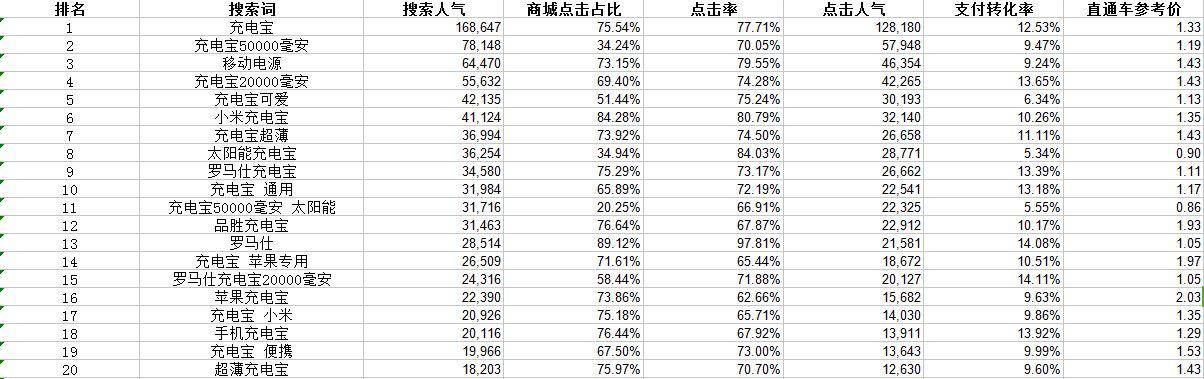 当你仔细看这些数据的时候,会不会觉得很奇怪,为什么“充电宝”这个关键词的付费转化率只有12.53%?意思是我在天猫或者淘宝搜索了“充电宝”这个关键词,然后不管我在A或者B或者C哪个店铺下单,不管怎么样,最后我下单了,我完成了支付转化,这个数字只有12.53%,也就是100个人去天猫或者淘宝搜索充电宝,最后不管他们在哪个店铺下单,实际上有12.53个人买了,剩下的87.47个人没有买。