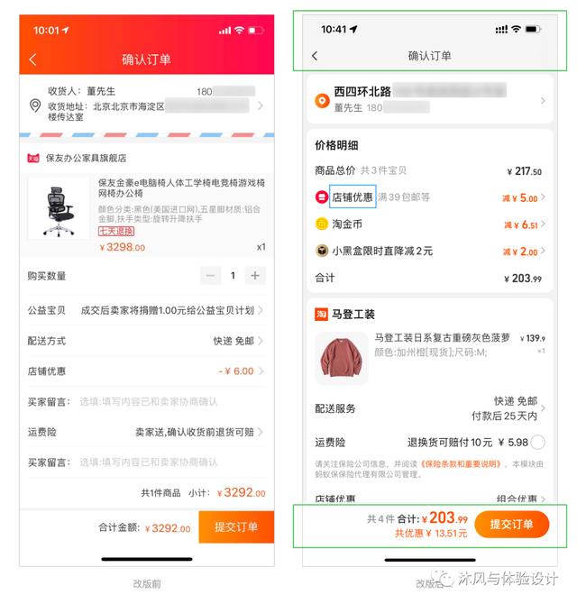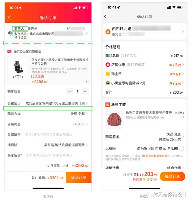 在新版界面中,移除了顶部的品牌颜色,使页面更加突出,同时底部最重要的CTA按钮“提交订单”成为页面最突出的元素。