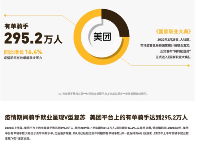 根据美团财报公布的数据,到2020年底,共有950万外卖骑手通过美团平台增加了收入,但活跃骑手没有那么多。活跃骑手数据请参考美团2020年骑手就业报告:“2020年上半年,骑行者295.2万人”。